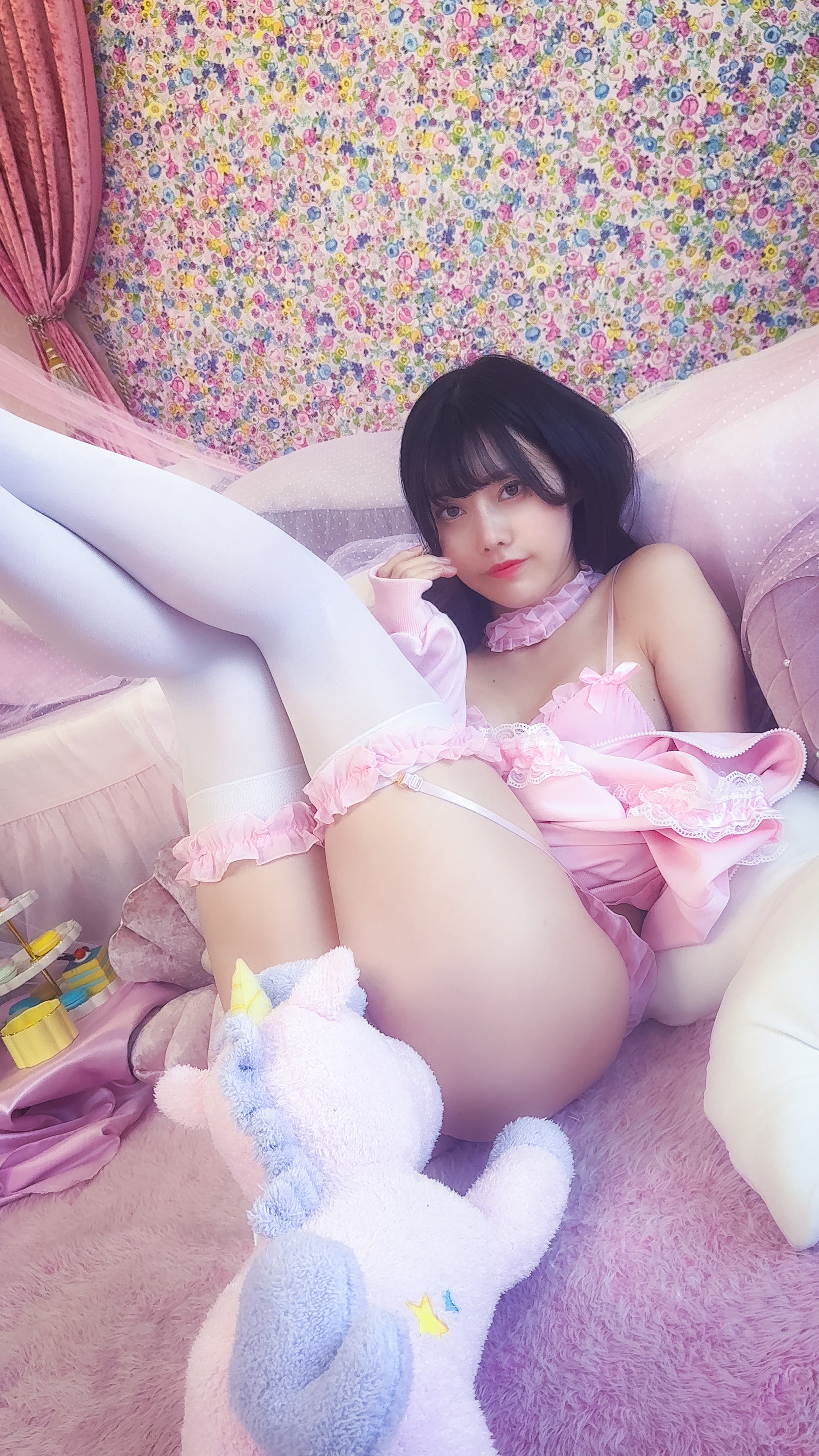 Japanese gravure model Rea Momosato sharing a private moment with you in her comfortable, pink playroom.